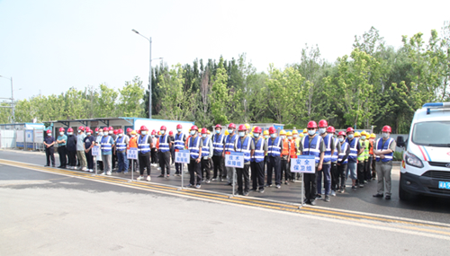 本次演练以因强降雨造成滹沱河和太平河洪水爆发,即将对项目部造成威胁为背景,模拟项目部员工发现险情后,立刻向项目部防汛值班领导报告,值班领导向指挥长进行报告,指挥长下令立刻启动应急预案,各应急小组迅速进入应急备战状态,配备防汛机具,迅速奔赴现场抢险,设置警示标志和安全警戒区域,组织人员疏散,抢救重要物资,加固土坡,装运沙袋,同时组织修复道路,恢复交通,保证撤离路线畅通,进行抢险救援全过程。