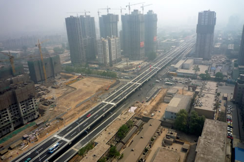 | 和平路是石家庄市北翼东西向的一条城市主干道,是石家庄市总体规划中的“四横”之一。和平路跨线桥(红军街——棉一立交桥)工程始于红军大街,跨越中华大街、九中街、北新街、车辆厂前街、京广线、胜利大街、平安大街、长征街后与棉一立交桥连接,高架桥全长3616米。 由我公司承建的一标段西起红军大街,东止于北新街东220米,总长1621.267m,由高架桥梁、道路、排水管道、道路照明等工程项目组成,是全线三个标段中工程量最大的标段。2009年4月30日主桥主路正式通车,比预定工期提前了10个月。 “和平路跨线桥工程的建成通车,标志着省会城市基础设施建设翻开崭新的一页,对完善市区路网结构和改善市民出行环境、进一步改善城市面貌意义重大。”---燕赵晚报 2009年5月1日 头版